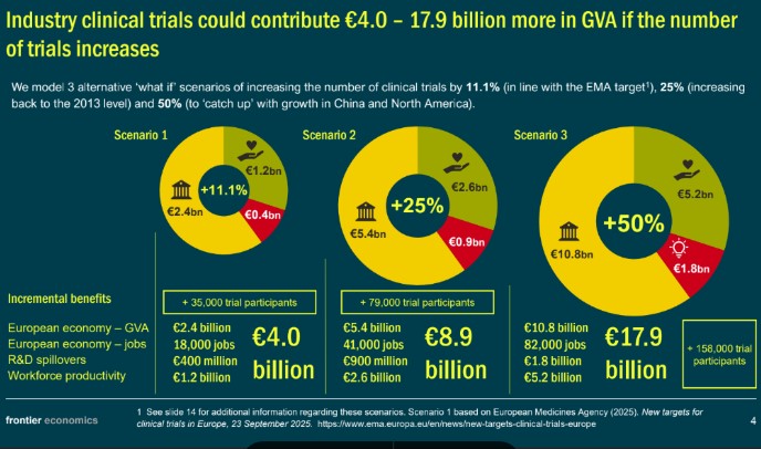 35.000 Ευρωπαίοι θα επωφεληθούν από την πρόσβαση σε πρωτοποριακές ιατρικές θεραπείες εάν επιτευχθούν οι στόχοι της ΕΕ για την προσέλκυση κλινικών μελετών. Τα συστήματα υγείας της ΕΕ και η ευρύτερη οικονομία θα επωφεληθούν επίσης από επιπλέον χρηματοδότηση ύψους 4 δισ. ευρώ ετησίως, τη δημιουργία 18.000 νέων θέσεων εργασίας και την αποτροπή τριών εκατ. ημερών ασθενείας, σύμφωνα με νέα έρευνα της Frontier Economics, που δημοσιεύθηκε από την EFPIA.