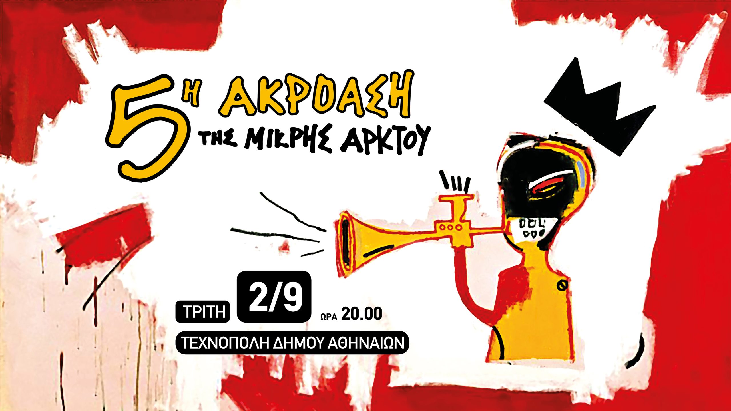Η Μικρή Άρκτος και η Τεχνόπολη Δήμου Αθηναίων παρουσιάζουν σε μια συναυλία – γιορτή, την Τρίτη 2 Σεπτεμβρίου στην κεντρική σκηνή της Τεχνόπολης τους διακριθέντες δημιουργούς και ερμηνευτές της 5ης Ακρόασης της Μικρής Άρκτου.