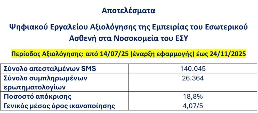 Δείτε μόνοι σας τα συγκεντρωτικά αποτελέσματα του εργαλείου της αυτοαξιολόγησης από τους ίδιους τους χρήστες του ΕΣΥ. Έχουμε ήδη βαθμολογία από πραγματικούς 26:364 ασθενείς, που μας απάντησαν αφού έλαβαν εξιτήριο. Γενικός μέσος όρος ικανοποίησης 4,07/5 …αυτό ειναι το «ΕΣΥ που… pic.twitter.com/9YHJzVwl1W