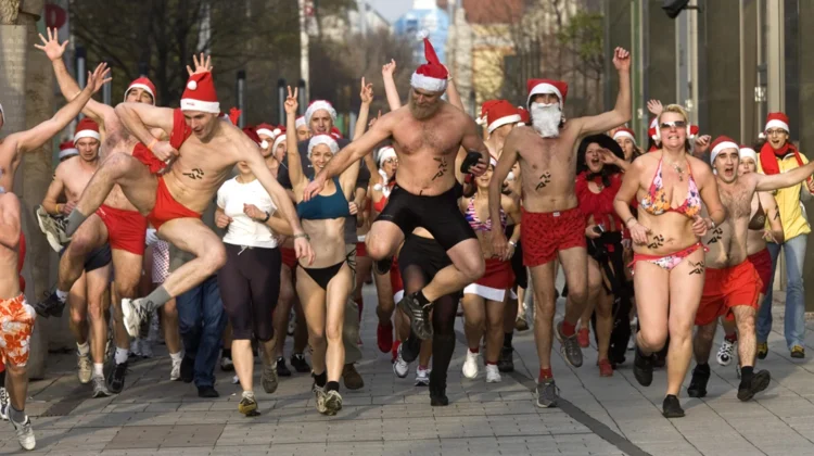 Αψηφώντας το τσουχτερό κρύο και κάθε έννοια χειμωνιάτικης… ένδυσης, δεκάδες δρομείς στη Βουδαπέστη φόρεσαν κόκκινα μαγιό και σκουφάκια του Άγιου Βασίλη και βγήκαν στους δρόμους για τον ετήσιο αγώνα «Half-Naked Santa Run». Η θερμοκρασία μπορεί να ήταν κοντά στο μηδέν, ωστόσο το κέφι και η αντοχή στο κρύο, ήταν στα ύψη.