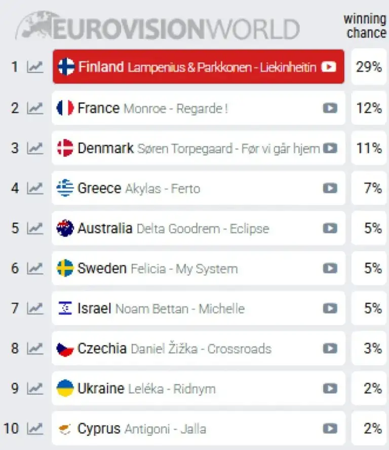 Στην κορυφή του Eurovisionworld, η Φινλανδία μοιάζει προς το παρόν ανίκητη με το εντυπωσιακό 29%, ενώ τη δεκάδα συμπληρώνουν η Γαλλία, η Δανία και το Ισραήλ.