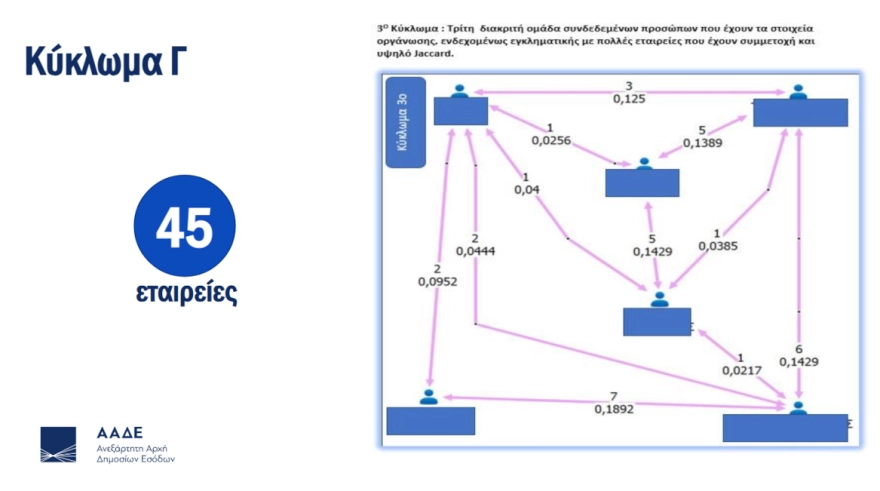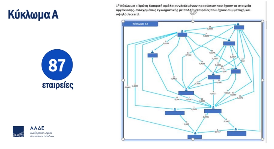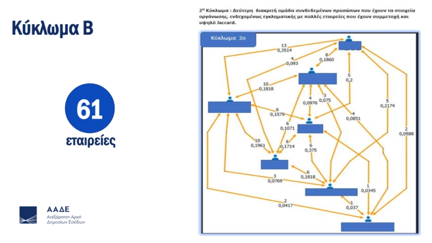 Με τη χρήση των καινοτόμων μεθόδων ανάλυσης, δύο τουλάχιστον πρόσωπα εντοπίστηκαν ως συνδεδεμένα και συνεργαζόμενα καθώς συνυπήρχαν σε κοινό εταιρικό σχήμα, είτε ως διαχειριστές είτε ως μέλη ή εταίροι ή μέτοχοι.