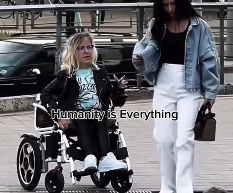 Συγκεκριμένα η κοπέλα στέκεται πάνω από δεκάδες σκαλιά κοιτώντας τους ανθρώπους γύρω της, χωρίς όμως να ζητάει τη βοήθειά τους. Ο κόσμος πάει και έρχεται, ενώ όλοι την κοιτούν, κανένας δεν μπαίνει στην διαδικασία να σταματήσει για 1 λεπτό και να τη βοηθήσει.