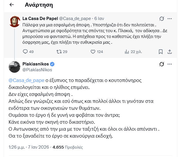 Υπογράμμισε ότι ο χρήστης δεν είχε λάθος άποψη, αλλά απλώς αγνοούσε – όπως και πολλοί άλλοι – όσα διαδραματίζονταν μέσα στις οικογένειες των θυμάτων. Και κατέληξε με την ίδια κινηματογραφική αναφορά, προαναγγέλλοντας ότι η «σκηνή» θα παιχτεί ξανά.