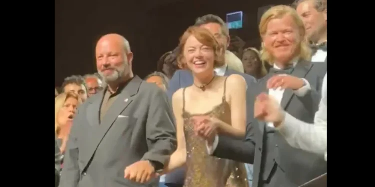 Η στιγμή ήταν τόσο έντονη, που η Στόουν, με τον σύζυγό της Ντέιβ ΜακΚάρι (Dave McCary) να βρίσκεται πίσω της, δάκρυσε από χαρά.