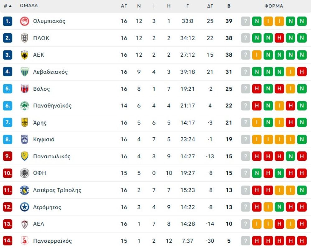 Tα αποτελέσματα της 16ης αγωνιστικής: