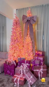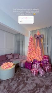 Με τη βοήθεια του αγαπημένου της διακοσμητή, Στέφανου, δημιούργησε ένα παραμυθένιο ροζ σκηνικό, στολίζοντας τρία εντυπωσιακά χριστουγεννιάτικα δέντρα ίδιου χρώματος με λευκά φωτάκια και μεγάλες κορδέλες, τα οποία συνόδευσε με κουτιά δώρων.