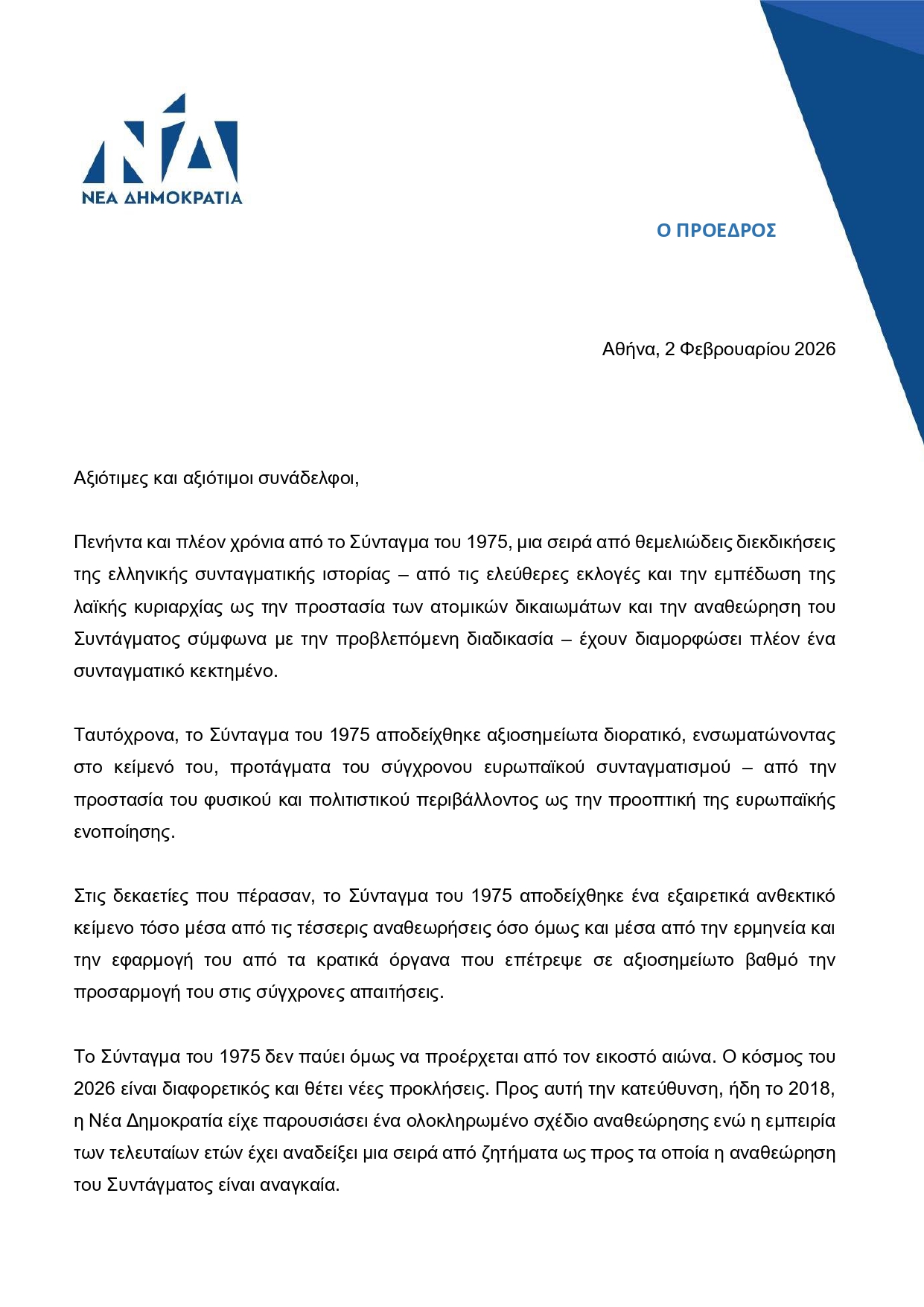 Με μία ιστορική αναδρομή ξεκινάει η επιστολή του πρωθυπουργού Κυριάκου Μητσοτάκη προς τα μέλη της Κοινοβουλευτικής Ομάδας της Νέας Δημοκρατίας σχετικά με την Αναθεώρηση του Συντάγματος. Όπως αναφέρει ο πρωθυπουργός πάνω από πέντε δεκαετίες από το Σύνταγμα του 1975 έχουν θεμελιώσει βασικά συνταγματικά κεκτημένα, όπως οι ελεύθερες εκλογές, η λαϊκή κυριαρχία και η προστασία των ατομικών δικαιωμάτων, με την αναθεώρηση να τηρείται σύμφωνα με τη προβλεπόμενη διαδικασία. Το κείμενο επισημαίνει ότι το Σύνταγμα του 1975 αποδεικνύεται διορατικό και ανθεκτικό, καθώς ενσωματώνει στοιχεία ευρωπαϊκού συνταγματισμού (προστασία περιβάλλοντος, ευρωπαϊκή ενοποίηση) και προσαρμόζεται μέσω ερμηνείας και εφαρμογής από τα κρατικά όργανα.