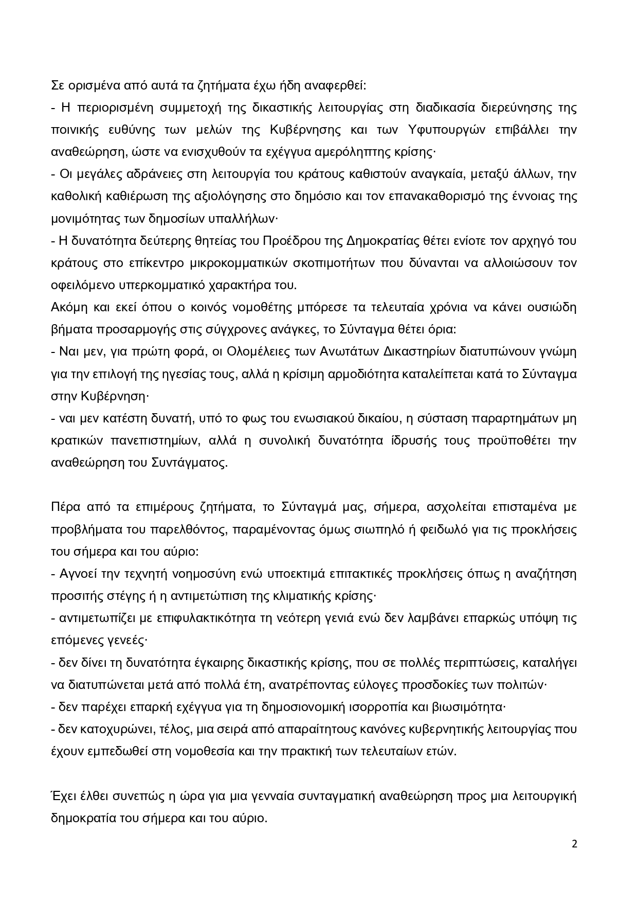 «Επαναλαμβάνω ότι πρόθεσή μας είναι μία γενναία, μία τολμηρή Συνταγματική Αναθεώρηση, που θα απαντά στις ανάγκες των εξελίξεων. Γι’ αυτό θα πρέπει, οπωσδήποτε, να προβλέπει και δικλίδες οι οποίες θα εγγυώνται τη μόνιμη δημοσιονομική ισορροπία, τη συνεπή κυβερνητική δράση αλλά και την ορθότητα των κομματικών υποσχέσεων, ώστε η χώρα να μην διολισθήσει ποτέ ξανά στα επικίνδυνα μονοπάτια του λαϊκισμού. Αυτά που κρύβουν τις ολέθριες συνέπειες που προκαλούν. Κάτι που, δυστυχώς, έχουμε πληρώσει ακριβά» συμπληρώνει.