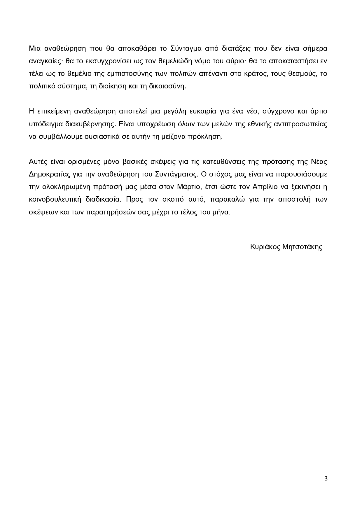 «Μοιράζομαι λοιπόν μαζί σας αυτές τις πρώτες σκέψεις, καλώντας κόμματα και πολίτες σε έναν εποικοδομητικό προβληματισμό. Με θετικές προτάσεις και αίσθηση της κοινής ευθύνης απέναντι στην πατρίδα και στο μέλλον. Ένα αίτημα της ίδιας της κοινωνίας, που αναζητά ευρύτερες συναινέσεις. Με επιχειρήματα ουσίας πέρα από κομματικές σκοπιμότητες και στόχο μία σύγχρονη ευρωπαϊκή δημοκρατία. Ένα δυναμικό βήμα προόδου που πρέπει αλλά και μπορούμε να κάνουμε όλοι μαζί. Εξάλλου, το ίδιο το Σύνταγμα μας επιβάλλει να αναζητήσουμε συναινέσεις αν θέλουμε πραγματικά να πετύχουμε τις μεγάλες αλλαγές που χρειάζεται ο καταστατικός μας χάρτης. Εύχομαι η διαδικασία της Συνταγματικής Αναθεώρησης να αποτελέσει μια απάντηση στην τοξικότητα και τη στείρα κομματική περιχαράκωση που διακρίνει το πολιτικό μας σύστημα» κλείνει το μήνυμα του.