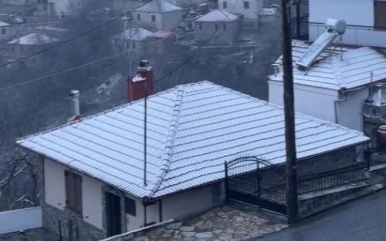 Η χιονόπτωση, η οποία ξεκίνησε κατά τη διάρκεια της νύχτας, έντυσε στα λευκά τις στέγες των σπιτιών και τις πλαγιές των ορεινών όγκων που περιβάλλουν την περιοχή.
