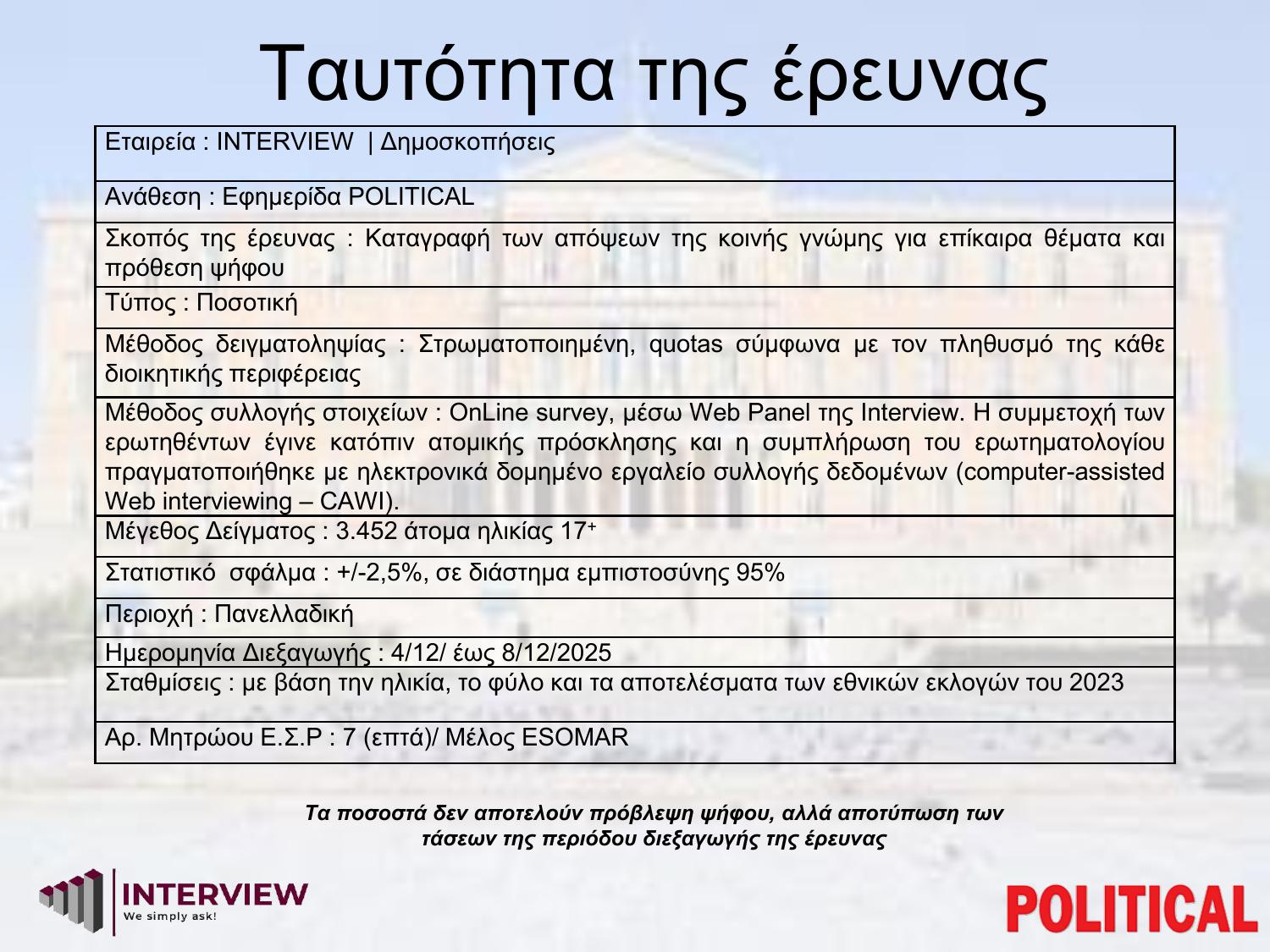 Η νέα δημοσκόπηση της Interview για την εφημερίδα Political, επιβεβαιώνει ότι ο «κανένας» εξακολουθεί να αποτελεί τον βασικό ανταγωνιστή του Κυριάκου Μητσοτάκη στο ερώτημα της εμπιστοσύνης για τη διακυβέρνηση της χώρας. Οι υπόλοιποι πολιτικοί αρχηγοί κινούνται σε χαμηλά επίπεδα, χωρίς ουσιαστική μεταβολή της δυναμικής τους.