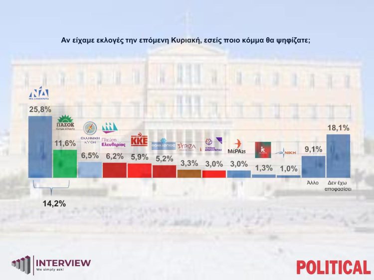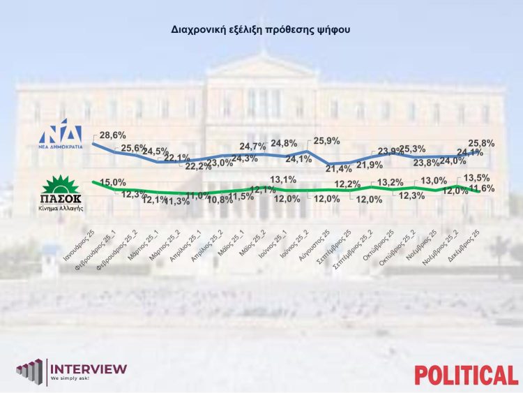 Η ΝΔ παραμένει μπροστά με μεγάλη διαφορά, ενώ το ΠΑΣΟΚ υποχωρεί, καταγράφοντας απώλειες.