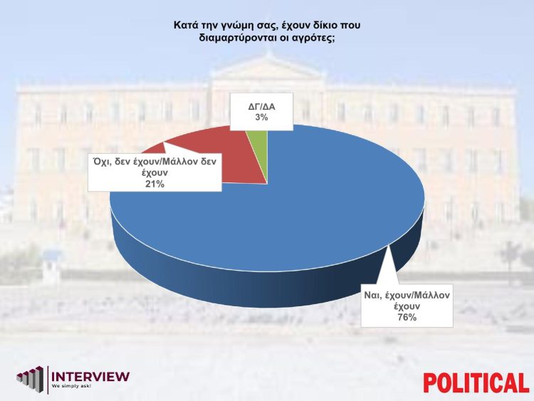 - 76% θεωρεί ότι οι αγρότες έχουν δίκιο να διαμαρτύρονται.