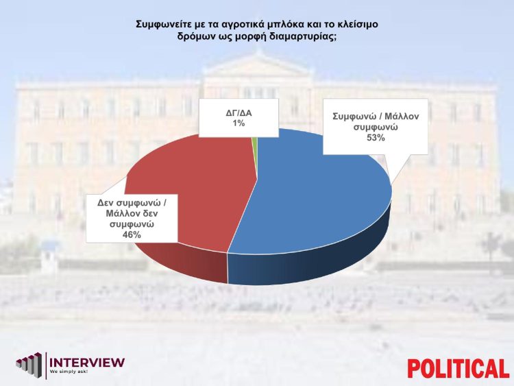 - 53% συμφωνεί με τα μπλόκα και το κλείσιμο δρόμων ως μορφή διαμαρτυρίας.