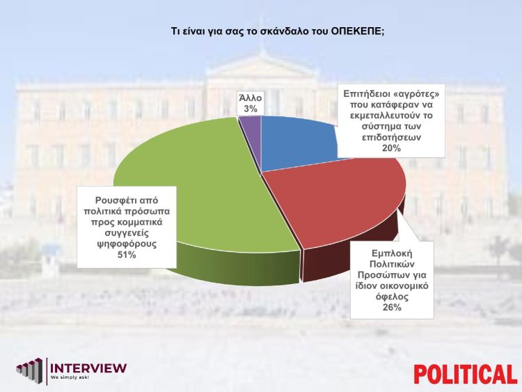 Ταυτόχρονα, στην ερώτηση για την «πηγή» του σκανδάλου του ΟΠΕΚΕΠΕ, οι απαντήσεις δείχνουν ότι οι πολίτες δεν βλέπουν το ζήτημα ως οργανωμένη ανάμειξη πολιτικών προσώπων για ίδιον όφελος, αλλά κυρίως ως ρουσφετολογικές πρακτικές: