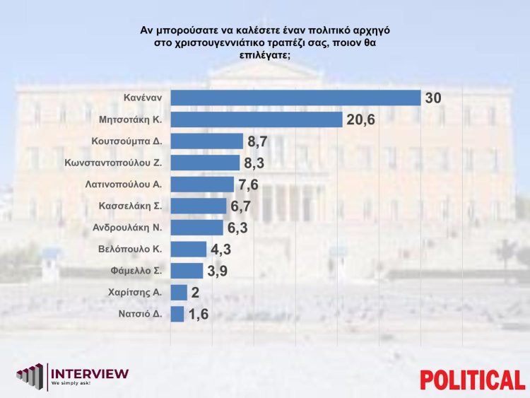 Στο ιδιαίτερο ερώτημα «ποιον πολιτικό θα καλούσατε στο χριστουγεννιάτικο τραπέζι», ο «κανένας» παραμένει πρώτος με 30%, ενώ ακολουθούν: