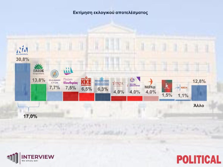 Στην εκτίμηση εκλογικού αποτελέσματος, η ΝΔ καταγράφεται στο 30,8%, επιτυγχάνοντας τον στρατηγικό στόχο της υπέρβασης του ψυχολογικού ορίου του 30%.
