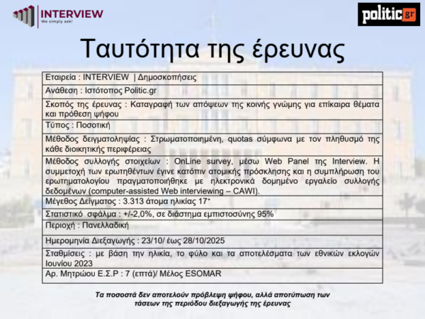 Η νέα δημοσκόπηση της Interview αποτυπώνει ένα πολιτικό τοπίο σταθερότητας για τη Νέα Δημοκρατία και ταυτόχρονα έντονης αμηχανίας για την αντιπολίτευση.