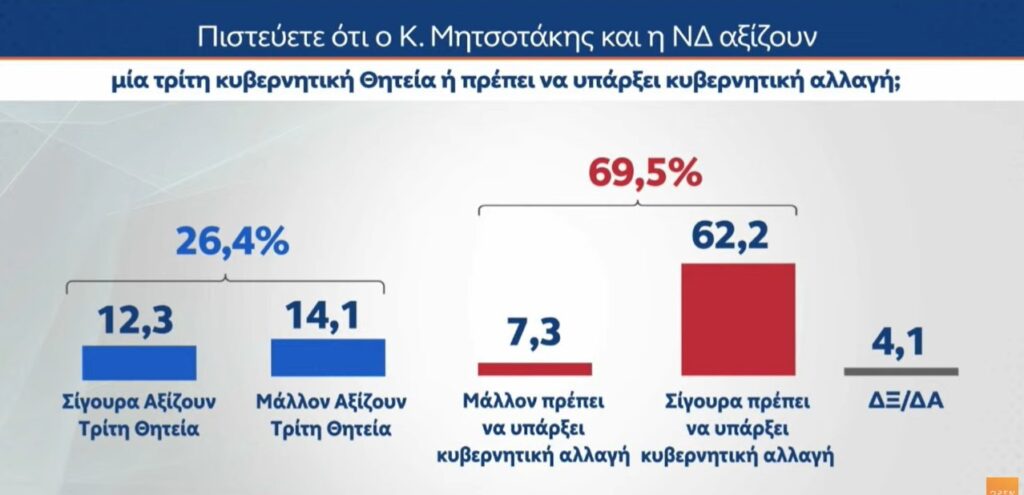 Στο ερώτημα αν ο Κυριάκος Μητσοτάκης και η Νέα Δημοκρατία αξίζουν μια τρίτη κυβερνητική θητεία ή αν πρέπει να υπάρξει κυβερνητική αλλαγή, μόλις το 26,4% απαντά θετικά.
