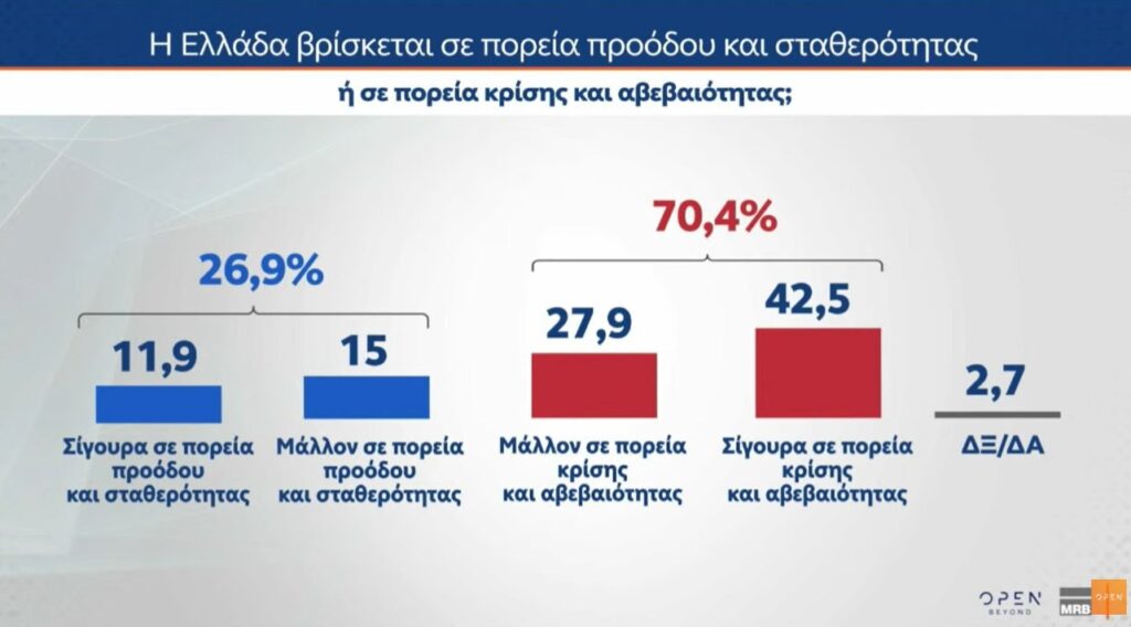 Μόλις το 26,9% θεωρεί ότι η χώρα βρίσκεται σε πορεία προόδου (11,9% «σίγουρα» και 15% «μάλλον»).