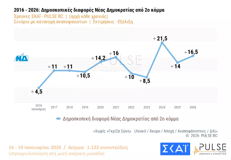 Η Pulse πραγματοποίησε νέα δημοσκόπηση για τον ΣΚΑΪ, με τους πολίτες να απαντούν σε μια σειρά από ερωτήματα. Πιο αναλυτικά, η Νέα Δημοκρατία εμφανίζεται πρώτη με διαφορά 16,5 μονάδων από το ΠΑΣΟΚ, ενώ φαίνεται ότι θα σχηματιζόταν οκτακομματική Βουλή σε περίπτωση που γίνονταν αύριο εκλογές.