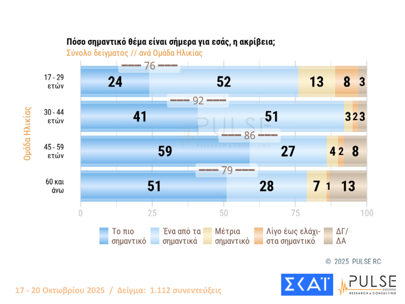Στην κοινωνία, η ακρίβεια αναδεικνύεται ως το πιο σοβαρό πρόβλημα, με το 84% των πολιτών να την αναγνωρίζει ως το κυριότερο ή ένα από τα σημαντικά ζητήματα. Σχετικά με την τροπολογία για τον Άγνωστο Στρατιώτη, το 46% συμφωνεί, ενώ το 44% διαφωνεί. Η αποδοχή της προϋπόθεσης για την συμμετοχή της Τουρκίας στο SAFE από την κυβέρνηση είναι διακομματική, όμως οι πολίτες ζητούν επιπλέον μέτρα.