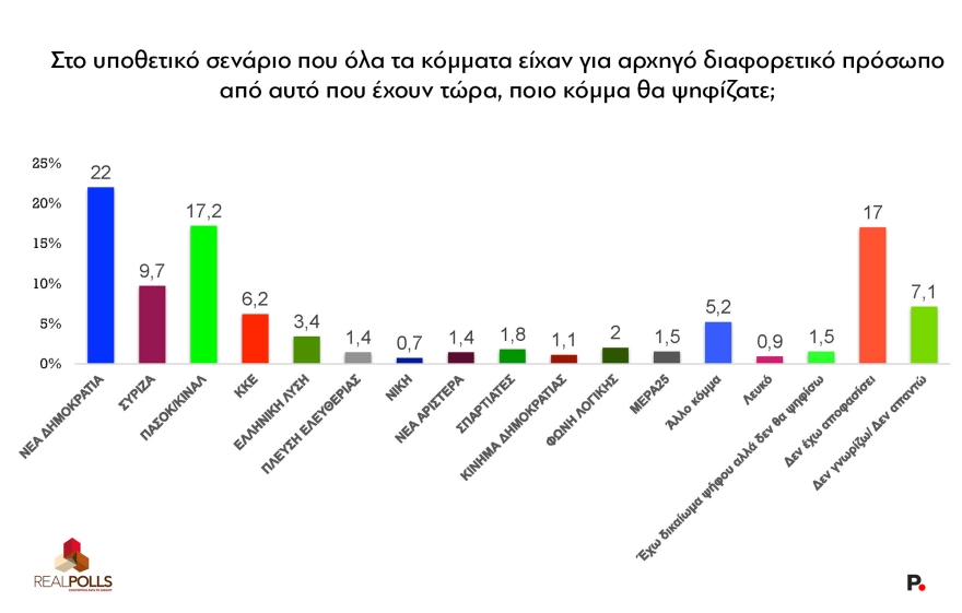 Ως προς το ΠΑΣΟΚ, χωρίς τον Νίκο Ανδρουλάκη το κόμμα ανεβαίνει στην πρόθεση ψήφου στο 17,2%, ενώ στο ίδιο ερώτημα η ΝΔ χωρίς Μητσοτάκη υποχωρεί στο 22%.