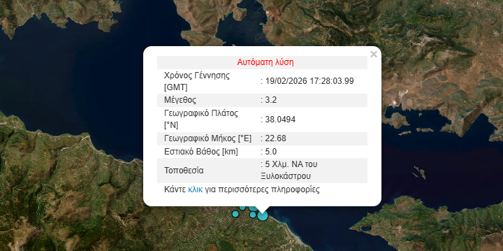 Διαδοχικές σεισμικές δονήσεις πραγματοποιήθηκαν λίγο πριν τις 19:30 το απόγευμα της Πέμπτης (19/2) κοντά στο Ξυλόκαστρο.