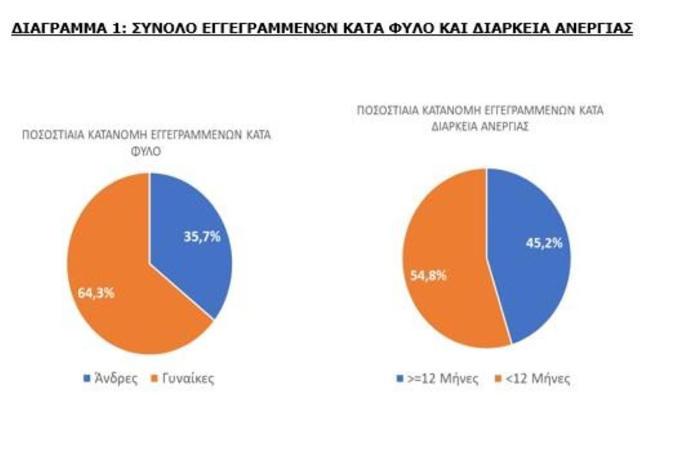 Διαφορετικά στοιχεία αποτυπώνουν την κατάσταση των εγγεγραμμένων ανέργων. Από τα 923.853 άτομα, το 45,2% (ή 417.293) είναι εγγεγραμμένα για 12 μήνες ή περισσότερο, ενώ το υπόλοιπο 54,8% (ή 506.560) έχει εγγραφεί για λιγότερο από 12 μήνες.