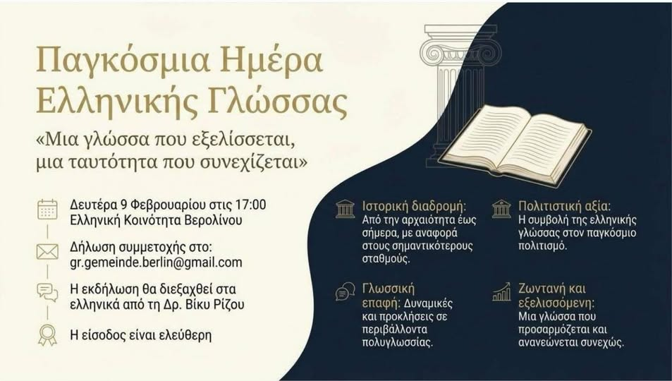 Η ελληνική γλώσσα δεν αποτελεί απλώς ένα πολύτιμο κομμάτι του παρελθόντος, αλλά μια ζωντανή και δυναμική μορφή έκφρασης που εξελίσσεται διαρκώς και συνομιλεί με τον σύγχρονο κόσμο. Με αφορμή την Παγκόσμια Ημέρα Ελληνικής Γλώσσας, η Ελληνική Κοινότητα Βερολίνου διοργανώνει ειδική εκδήλωση αφιερωμένη στη διαχρονική πορεία και τη σύγχρονη παρουσία της ελληνικής γλώσσας.