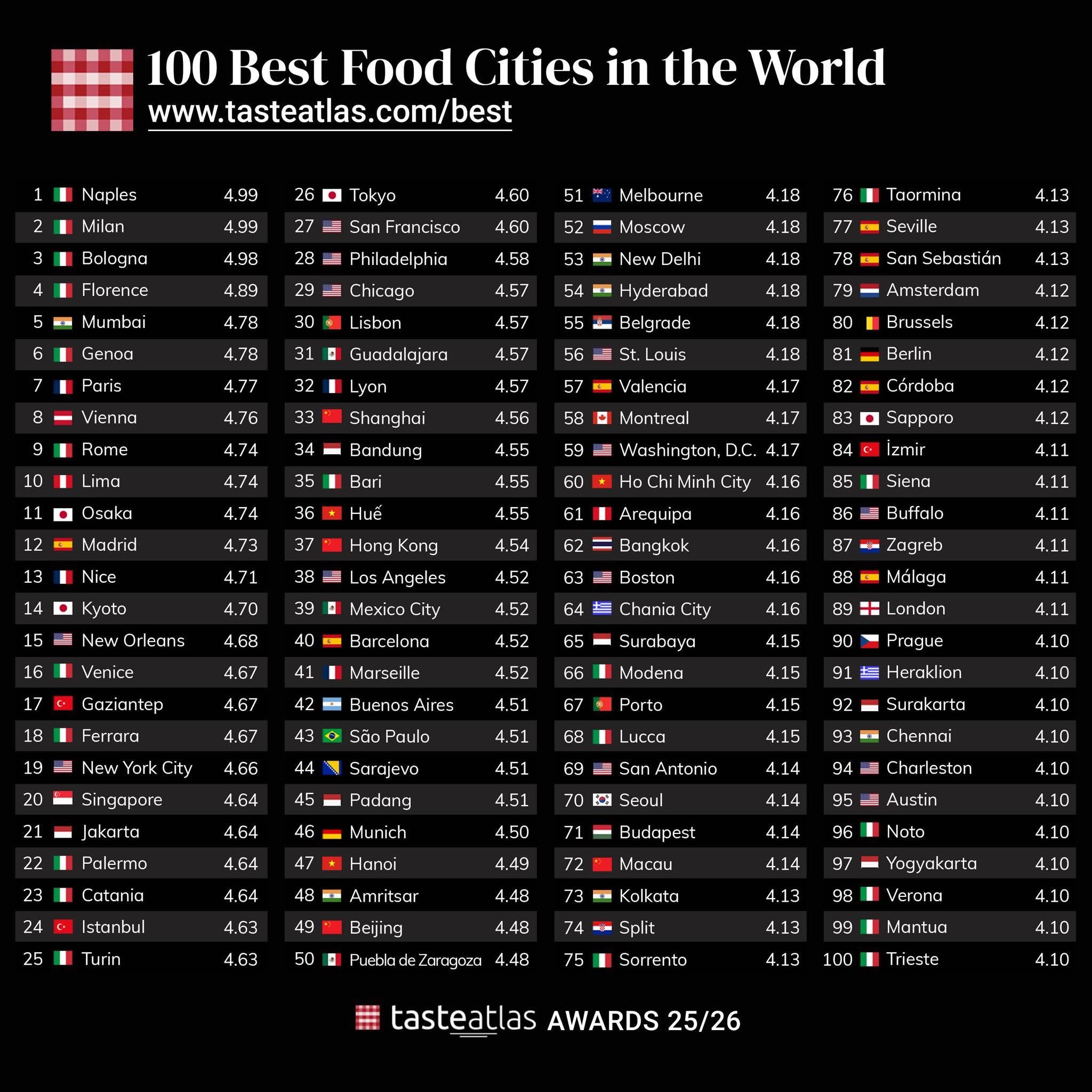 Η Νάπολη αναδείχθηκε η «βασίλισσα» του φαγητού για φέτος, ενώ παρά την υποχώρηση η χώρα μας συνεχίζει να ξεχωρίζει για τα παραδοσιακά της πιάτα, με τα τυριά, τις σαλάτες και τα γλυκά της να προβάλλονται σε όλο τον κόσμο.