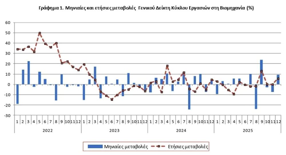 Παράλληλα, ο γενικός δείκτης παρουσίασε αύξηση 9,3% τον Δεκέμβριο 2025 σε σύγκριση με τον αντίστοιχο δείκτη του Νοεμβρίου 2025, ενώ σε μέσα επίπεδα πέρυσι, ο γενικός δείκτης παρουσίασε αύξηση 0,3% σε σύγκριση με τον αντίστοιχο δείκτη του δωδεκαμήνου Ιανουαρίου 2024-Δεκεμβρίου 2024, έναντι αύξησης 1,8% που σημειώθηκε κατά τη σύγκριση των αντίστοιχων προηγούμενων δωδεκαμήνων.