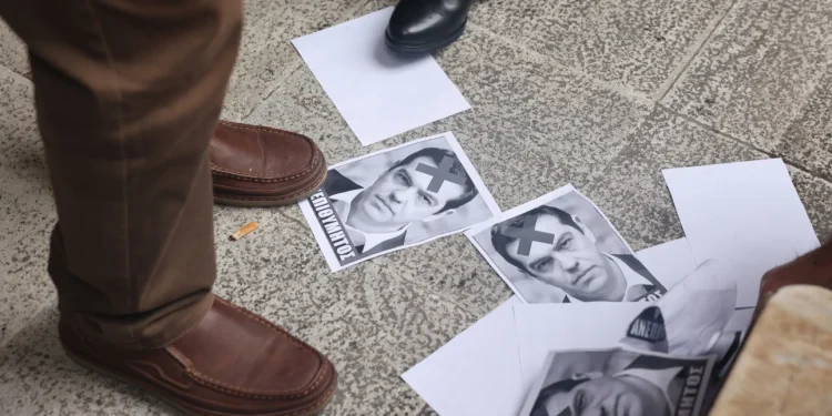 Μια ομάδα διαμαρτυρόμενων πέταξε φωτογραφίες του πρώην πρωθυπουργού, στις οποίες αναγραφόταν η λέξη «ανεπιθύμητος» και ένα «Χ» στο πρόσωπό του, εκφράζοντας με αυτόν τον τρόπο την αντίθεσή τους στην παρουσία του στη Θεσσαλονίκη.