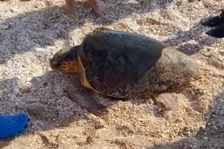 Λουόμενοι έσπευσαν κοντά στη χελώνα που ήταν τρομοκρατημένη και διαπιστώθηκε πως έφερε τραύμα στο κεφάλι ενώ άμεσα ειδοποιήθηκε το Λιμενικό, σύμφωνα με το agriniopress.gr.
