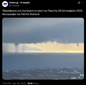 Η γεωγραφική θέση της Σαντορίνης —εκεί όπου συναντώνται θερμά και ψυχρότερα ρεύματα αέρα— καθιστά το νησί ιδανικό «σκηνικό» για τη δημιουργία τέτοιων φαινομένων. Αν και σπάνια προκαλούν ζημιές, οι υδροστρόβιλοι χαρίζουν κάθε φορά εντυπωσιακές εικόνες, θυμίζοντας τη δύναμη και την ομορφιά της φύσης στο Αιγαίο.