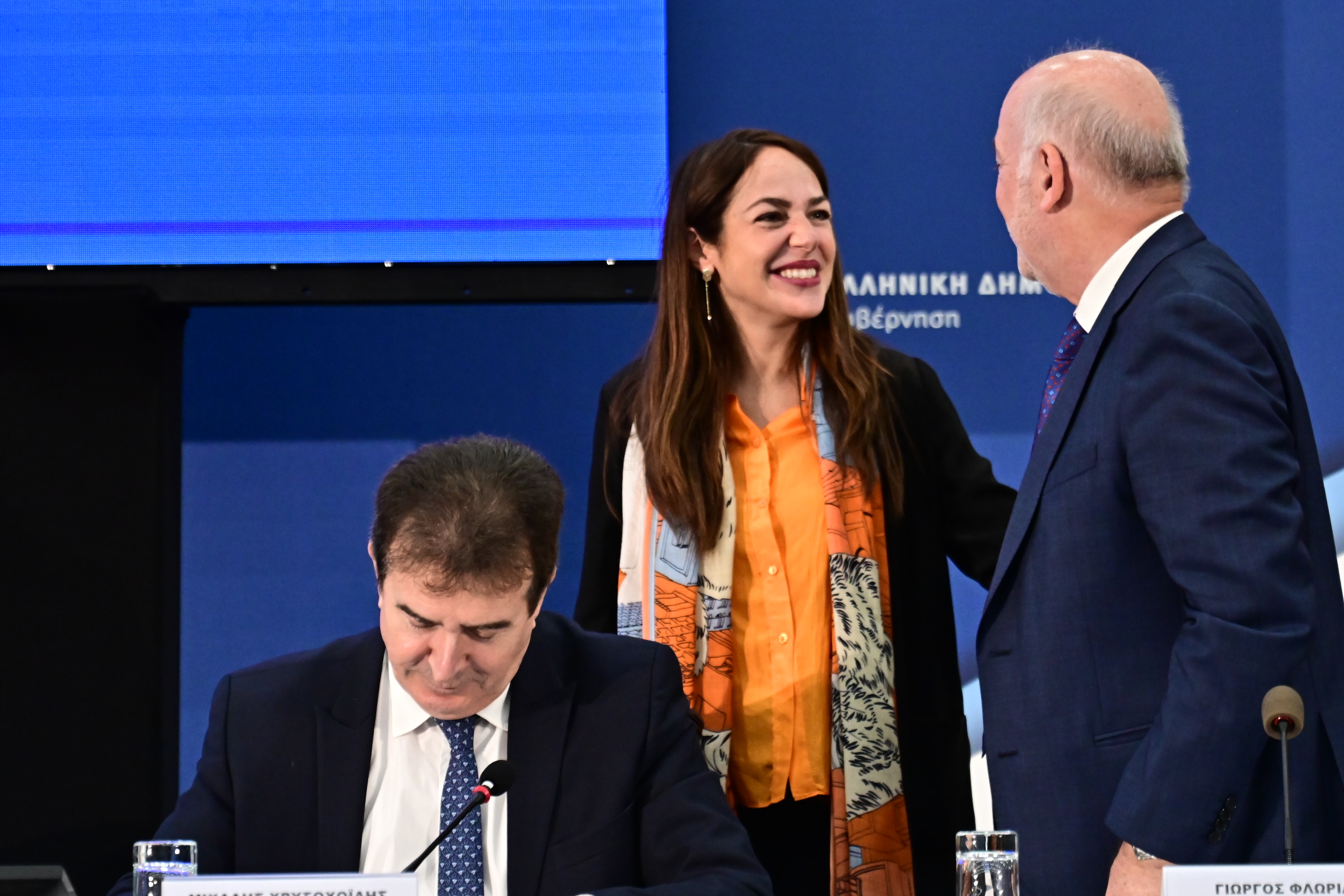Πριν πάρουν τη θέση τους στο πάνελ οι υπουργοί είχαν λίγο χρόνο για να ευχηθούν στη νέα μητέρα με αγκαλιές και φιλιά.