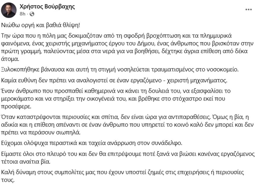 Όπως αναφέρει σε ανάρτησή του ο Αντιδήμαρχος Καθημερινότητας, Περιβάλλοντος και Ανακύκλωσης του δήμου, Χρήστος Βούρβασης, ο υπάλληλος που βρισκόταν στην πρώτη γραμμή, παλεύοντας μέσα στα νερά για να βοηθήσει, δέχτηκε άγρια επίθεση από δέκα άτομα, ξυλοκοπήθηκε βάναυσα και νοσηλεύεται τραυματισμένος στο νοσοκομείο.