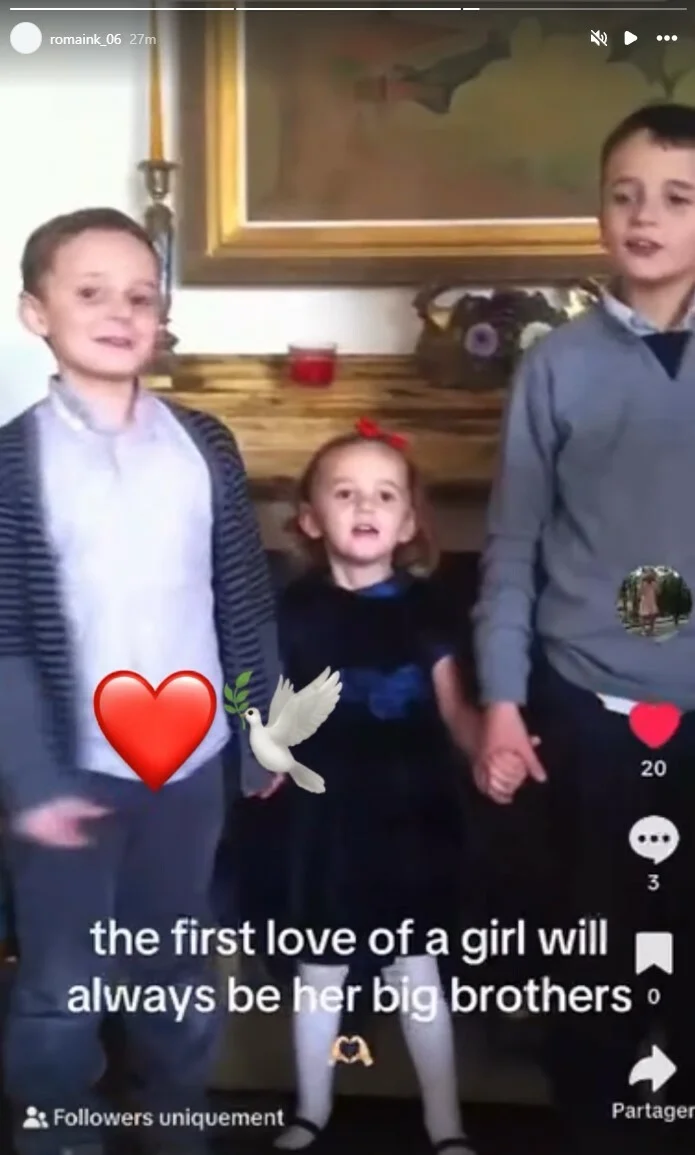Την ίδια στιγμή, ο αδελφός της, Ρομέν, έκανε ένα story από τα παιδικά τους χρόνια, μια καρδιά και ένα λευκό περιστέρι. «Η πρώτη αγάπη ενός κοριτσιού είναι πάντα τα μεγαλύτερα αδέλφια της», γράφει χαρακτηριστικά στο βίντεο, το οποίο είναι ένα σχετικό στιγμιότυπο με τον ίδιο, τον αδελφό του και την Αλίκη Καλλέργη, όσο ήταν μικρά παιδιά..