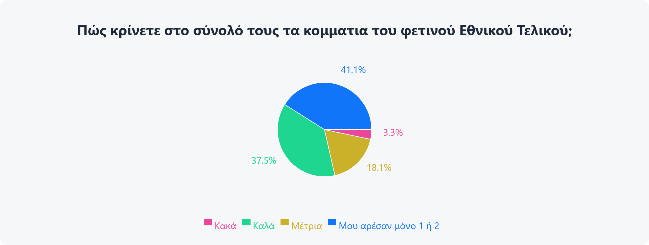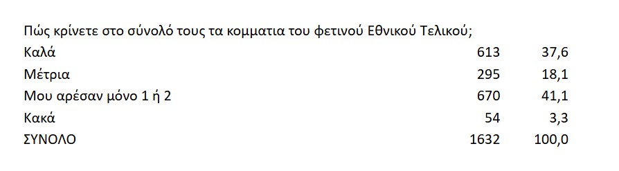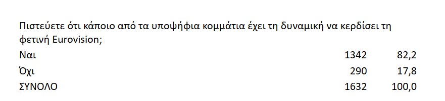 Μόλις το 3.3% των ερωτηθέντων κρίνει αρνητικά το σύνολο των τραγουδιών, γεγονός που πιστώνει στην ΕΡΤ μια σωστή επιλογή κατεύθυνσης.