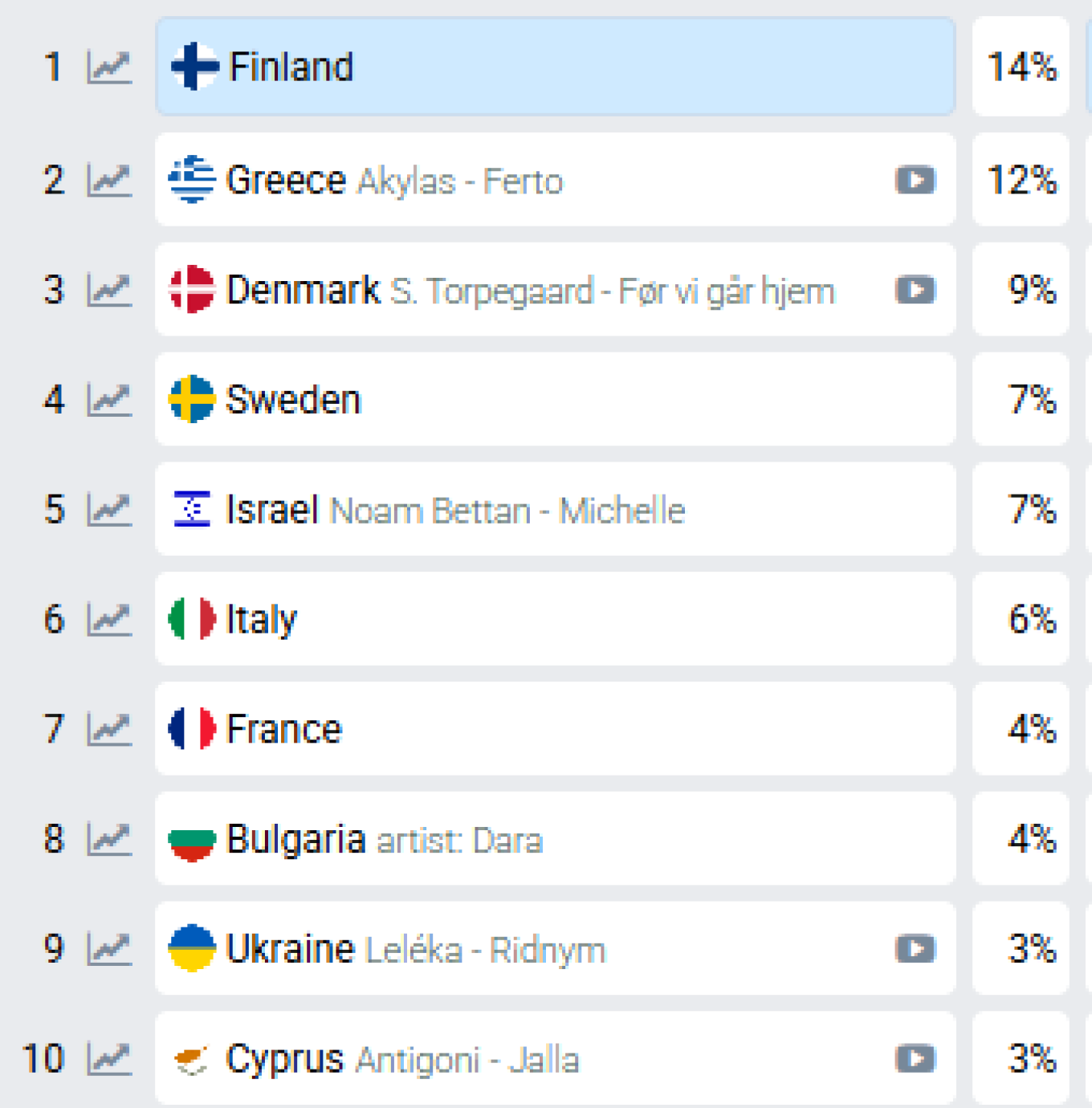 Σύμφωνα με τα τελευταία στοιχεία από το έγκυρο poll του Eurovisionworld, η Ελλάδα «απειλεί» ευθέως την πρωτιά, συγκεντρώνοντας ποσοστό 12%. Η απόσταση από την πρωτοπόρο Φινλανδία, που προηγείται με 14%, έχει εκμηδενιστεί, με τη δυναμική του Akyla να αυξάνεται μέρα με τη μέρα όσο πλησιάζουμε στον Μάιο.