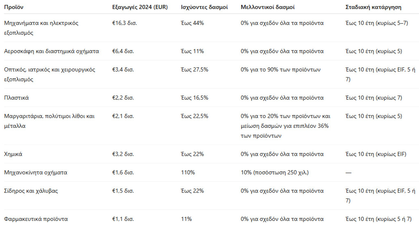 Οι ευρωπαϊκές εταιρείες πραγματοποιούν εξαγωγές μηχανημάτων και ηλεκτρικού εξοπλισμού ύψους 16,3 δισ. ευρώ, με τους ισχύοντες δασμούς να ανέρχονται στο 44%.