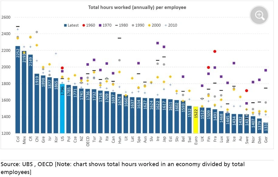 Οι εργαζόμενοι στις χώρες της Ευρωζώνης απασχολούνται συνολικά περίπου 15% λιγότερες ώρες σε σχέση με τους εργαζόμενους στις ΗΠΑ, κυρίως λόγω της μεγαλύτερης ετήσιας άδειας. Ωστόσο, η Ελλάδα αποτελεί αξιοσημείωτη εξαίρεση, καθώς οι Έλληνες εξακολουθούν να δουλεύουν πάνω από 40 ώρες την εβδομάδα.
