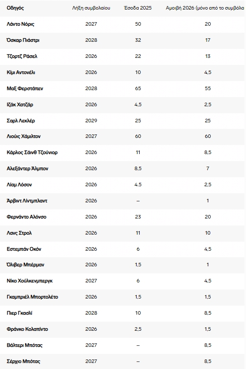 Στον πίνακα που ακολουθεί, μπορείτε να δείτε αναλυτικά τις αμοιβές (σε εκατομμύρια ευρώ) που κέρδισε κάθε οδηγός φέτος, καθώς και τα ποσά που θα εισπράξει από το συμβόλαιό του για το 2026. Οι αριθμοί είναι κατά προσέγγιση και δεν περιλαμβάνουν τις προσωπικές χορηγίες κάθε οδηγού.