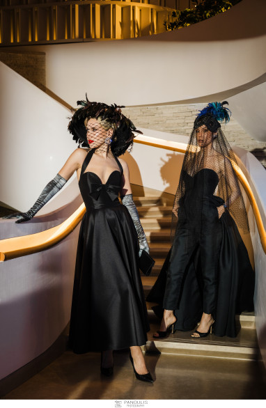 Η εκδήλωση κορυφώθηκε με ένα εντυπωσιακό couture moment του Maison Zoulias, καθώς δεκαπέντε μοντέλα κατέβηκαν την επιβλητική σκάλα του resort, παρουσιάζοντας δημιουργίες σε άσπρο και μαύρο, με έντονες θεατρικές αναφορές, αίσθηση masquerade, κομψότητα και μυστήριο.