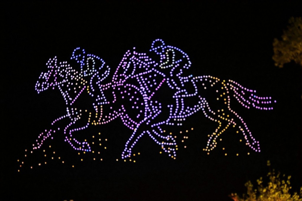 Συγχρονισμένη επίδειξη με drones συμπεριλαμβανομένων μοτίβων με πέταλα και χαρακτήρων «HKJC» και «WIN»