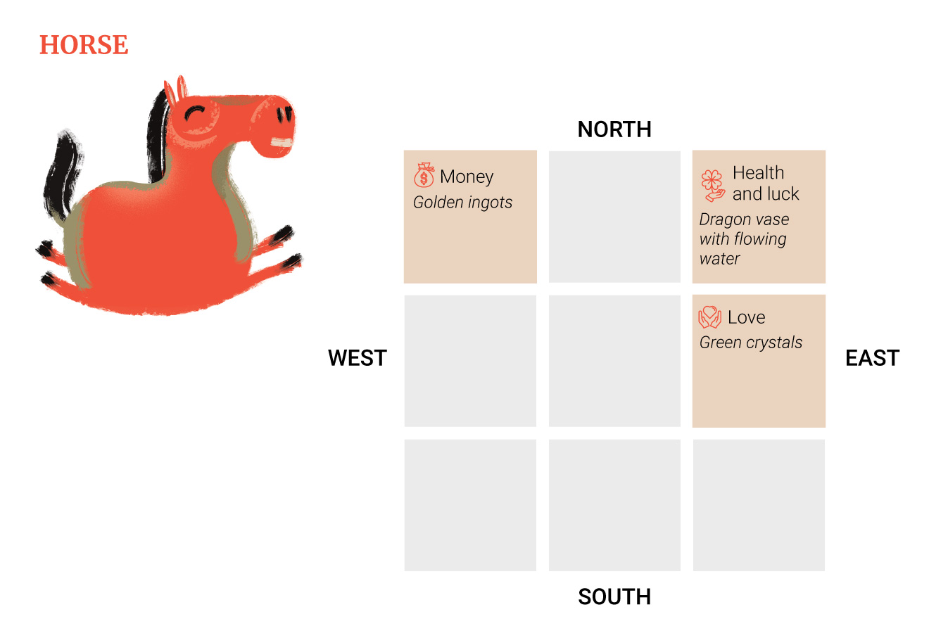 Η θέση για την ενίσχυση της υγείας και της γενικής τύχης είναι στο νότο, όπου πρέπει να τοποθετούνται στολίδια με κόκκινα, πορτοκαλί ή μοβ άλογα.