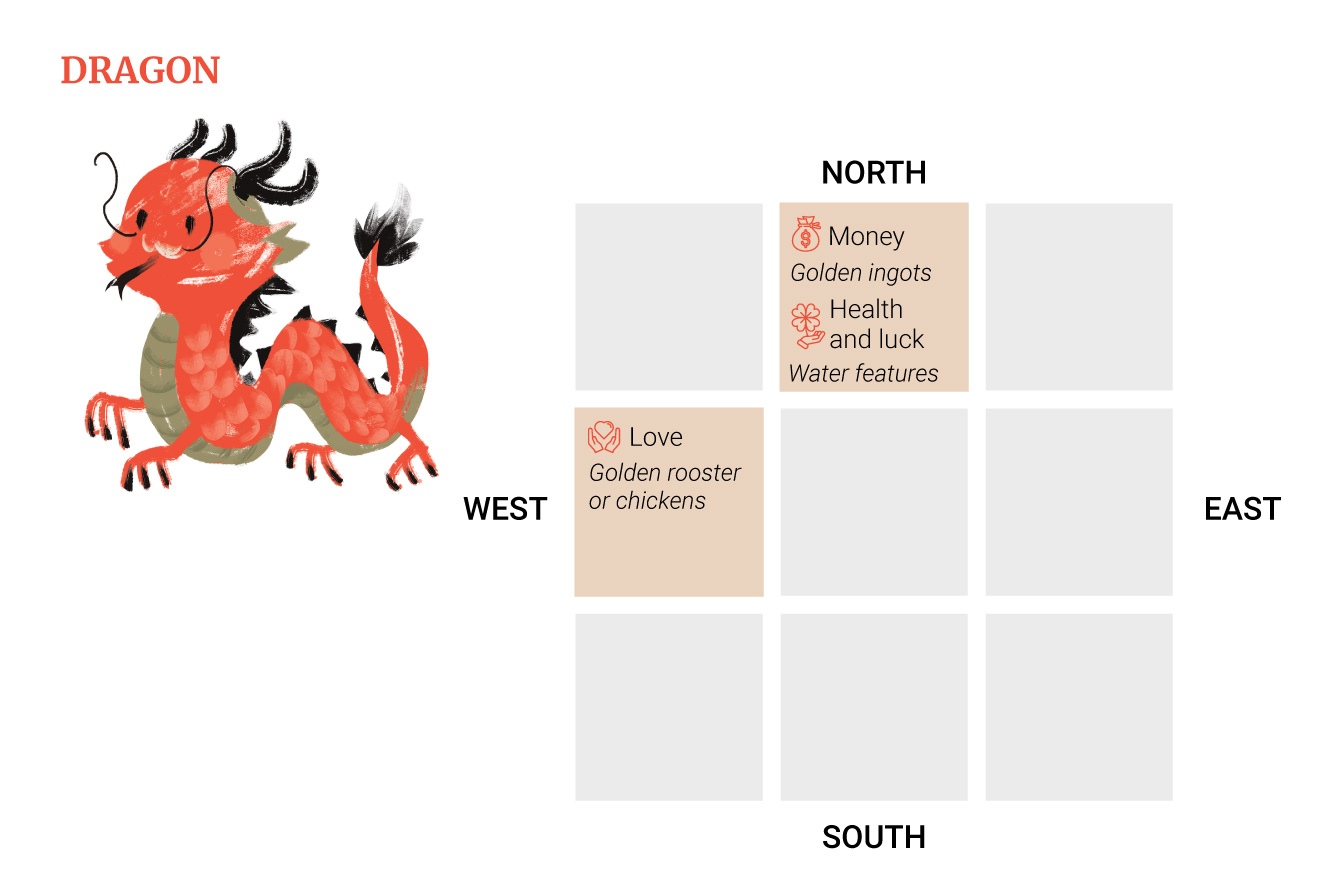 Η θέση για την ενίσχυση της υγείας και της γενικής τύχης θα είναι στα βορειοανατολικά, όπου θα πρέπει να τοποθετηθούν διακοσμήσεις ή στολίδια δράκων με τρεχούμενο νερό.