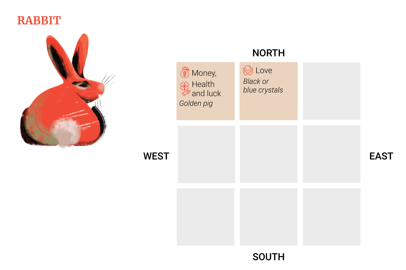 Η ερωτική θέση είναι στο βορρά, επομένως τα κουνέλια θα πρέπει να διακοσμήσουν αυτήν την περιοχή με μαύρες ή μπλε κρυστάλλινες διακοσμήσεις.