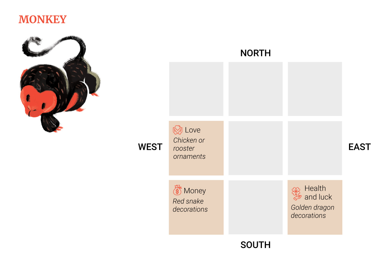 Η ερωτική στάση θα είναι στη δύση, επομένως οι πίθηκοι θα πρέπει να διακοσμήσουν αυτήν την περιοχή με στολίδια με θέματα ή μοτίβα κοτόπουλου ή κόκορα.